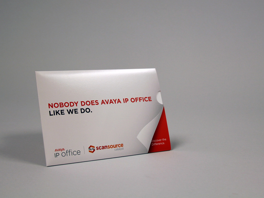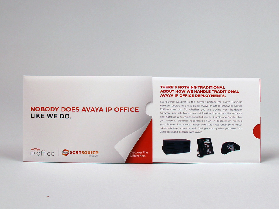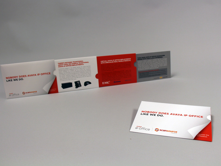 Avaya provides next-generation business collaboration, communications, and networking solutions to companies around the world. When they approached their agency Sandy Alexander about creating something unique and memorable to promote some of their new services, Sandy Alexander partnered with us. What they chose was our Telescoping Folder solution. This high-impact piece is extremely popular because of its form and function. As you pull on the tabs, additional panels of information slide out, just like a telescope.