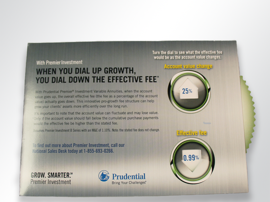 Prudential used this interactive wheel mailer to promote Prudential Premier Investment Variable Annuities. The mailer featured a paper wheel on the right-hand side that could be rotated manually to help readers understand what the effective fee would be as the account values change.