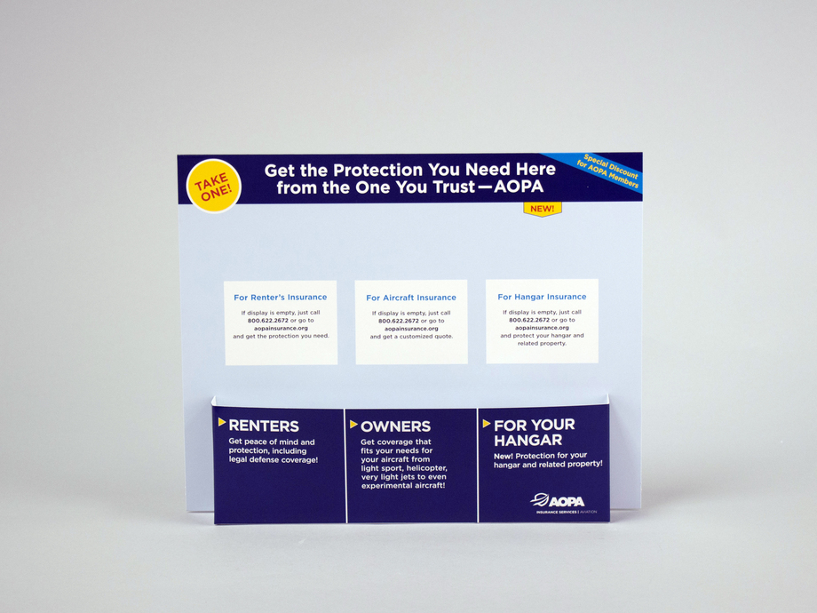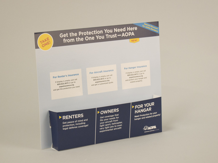 AOPA Insurance Services encouraged prospects to "take one" or "two" or "three" with this POP Display used to distribute information to the public about its 3 different insurance plans. This easy-to-set-up POP Display included 3 separate compartments, which each holding information on each of the different insurance programs.