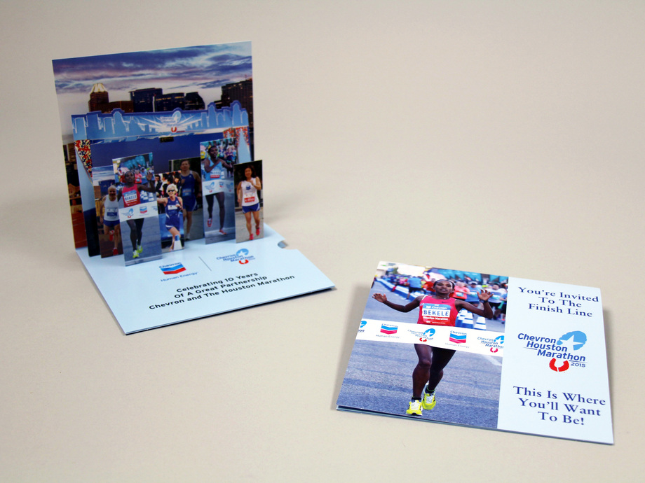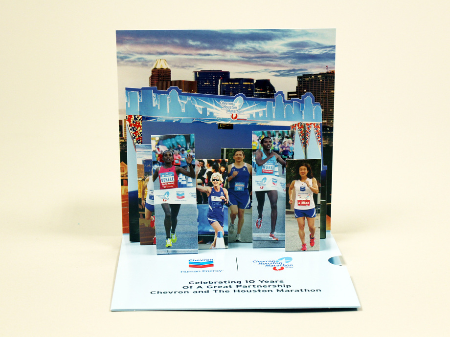Chevron and The Houston Marathon used this colorful pop up mailer to celebrate their 10 year partnership and to spread the word about their upcoming marathon. When you open up this seemingly flat mailer, images of several marathon runners pop up on the inside.