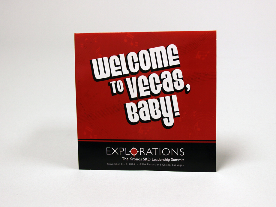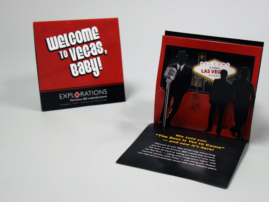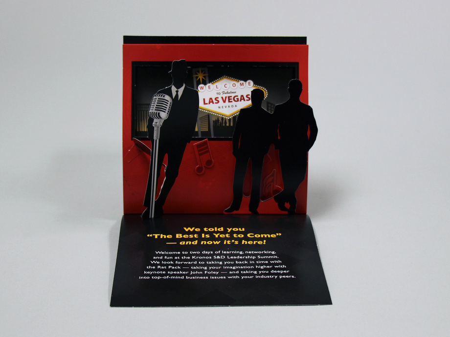 Kronos used this pop-up reference guide as an invitation to its S&D Leadership Summit taking place in Las Vegas. The inside of the reference guide pops up to display a silhouette of men in classic Las Vegas attire while the back of the invite included tabs containing additional information on the event's agenda, keynote, and even an area map.