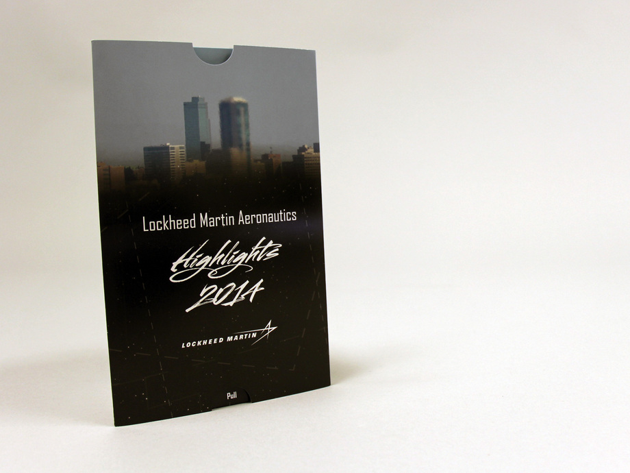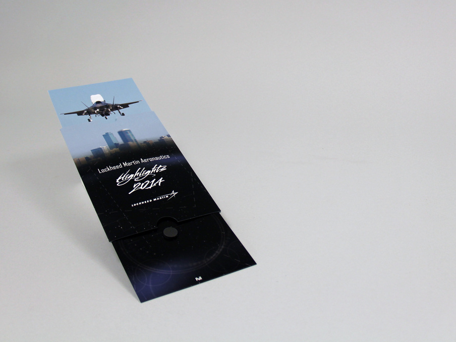 Lockheed Martin Aeronautics chose our Extendo® to deliver a special DVD containing highlights from 2014 to its customers. We worked with printer Best Press on the production of this unique DVD holder. When you pull on the panel containing the DVD, another panel automatically slides up at the top.