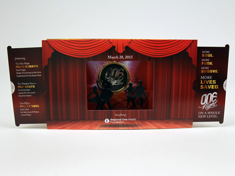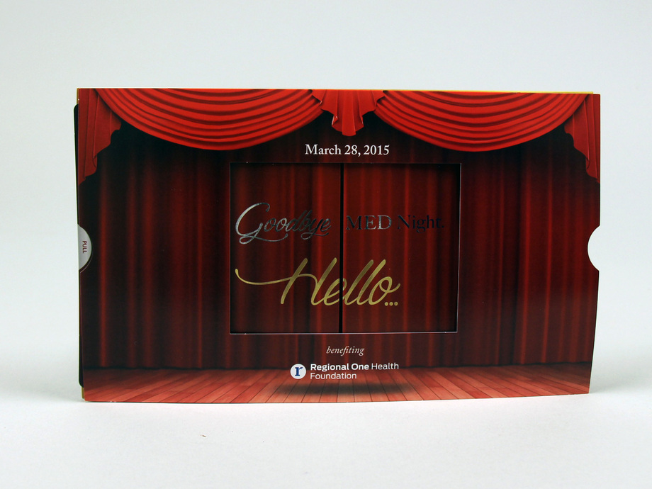 We produced this sound chip shadow box invite with RedRover Sales and Marketing for their client Regional One Health Foundation. This was used as an invitation for their annual fundraising gala. The piece starts out flat, but when you pull out on the tabs, it transforms into a 3-dimensional shadow box mailer complete with sound.