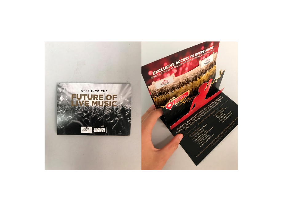 This 3 stage pop up promoted the benefits of being a season ticket holder at particular music venues. The dimensional showed a performers view of the crowd with a clear indicator of just how season ticket holder seats could be!