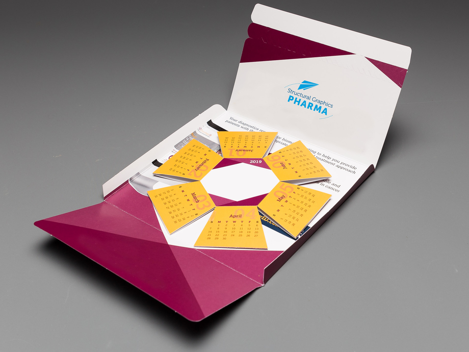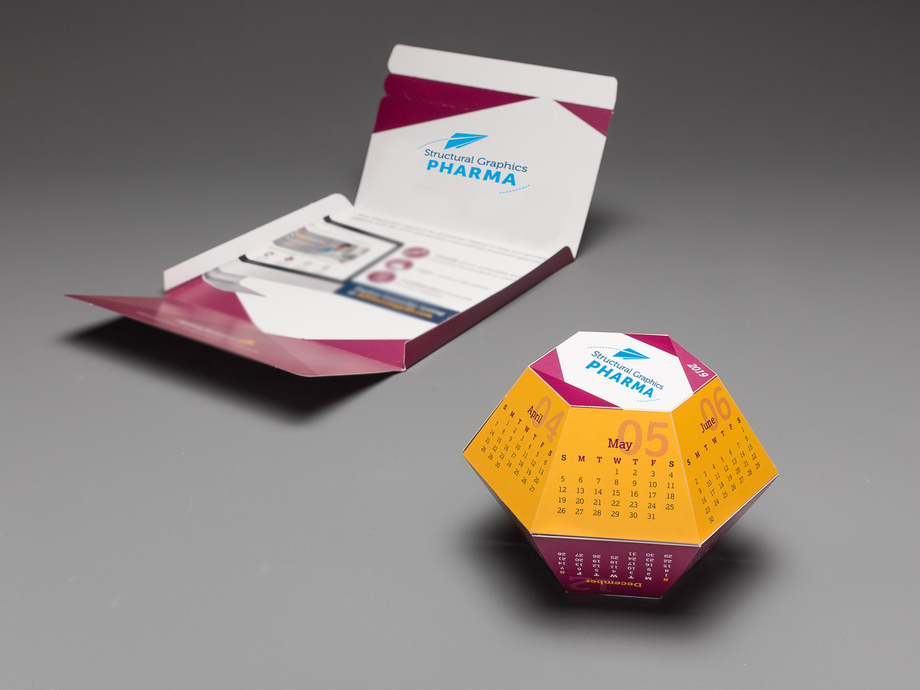 Tear off the zip strip on the outer envelope and a polygon automatically springs into shape. With fourteen individual facing panels polygons are not only great for displaying calendars, but product info as well.
