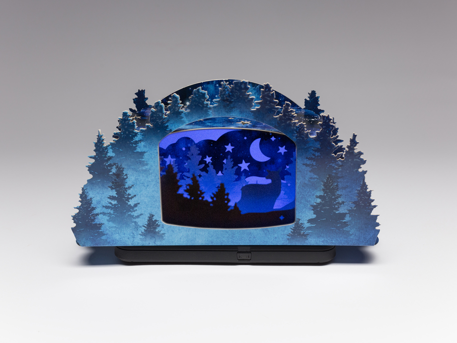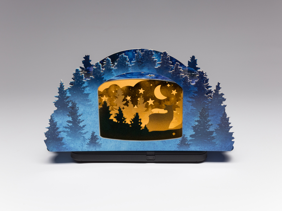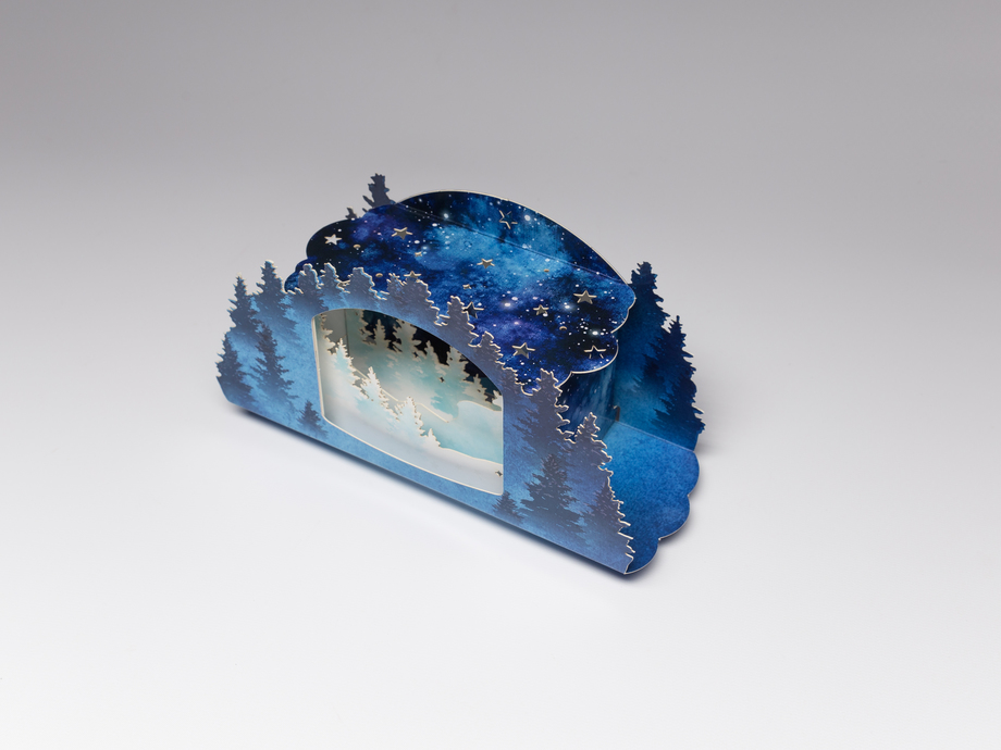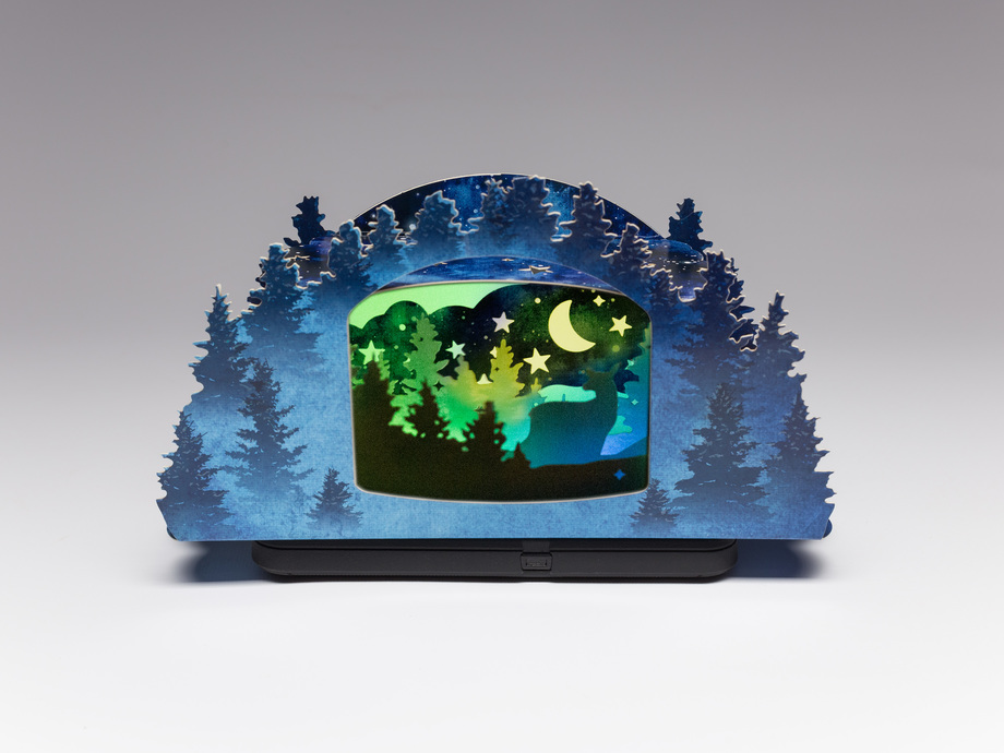 Structural Graphics' very own Creative Director, Erik Hluchan, and Art Director, Erin Fudge Smith, created this year's design; a magical winter forest scene that comes to life in a dimensional shadowbox which shines a light on greater forest sustainability. Hluchan had the idea to illuminate the shadowbox from below. He achieved this by developing a light display which appears on one's mobile device, once the QR code on the bottom of the holiday card is scanned. The light show that displays within the shadow box mimics the magical illumination of the aurora borealis.