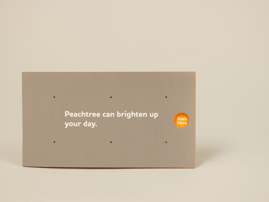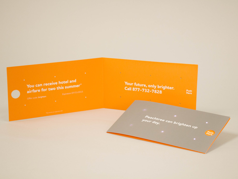 Innovative Print & Media Group asked us to help develop an engaging promotional mailer for their client Peachtree. What they chose was this direct mailer with lights. When you open up the mailer, LED lights automatically light up throughout the piece with the messaging "your future, only brighter" displayed on the inside.
